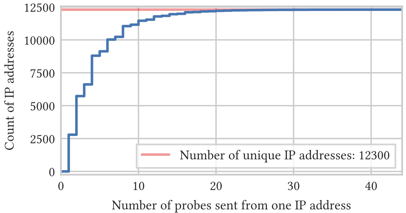 IP地址。51837次主动探测发自12300个独立来源IP地址,这些IP地址均位于中国。图3显示了每个独立IP地址发送的探测数量的分布。以前的研究发现“95%的地址只出现一次” [14, §5.3],与此形成对比的是,我们的测试发现,75%的地址发送一次以上的探测。表2列出了最常见的探测器IP地址。