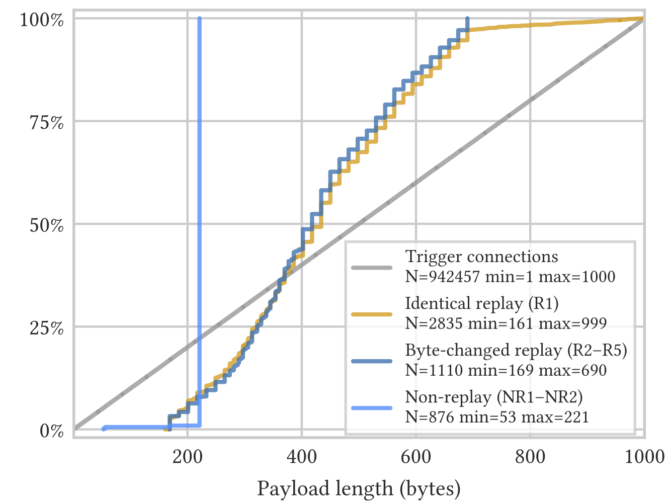 仅某些长度被重放。虽然客户端发送的数据包长度介于1至2000字节之间,但是几乎所有被判断为重放的探测,其负载长度都介于160至700字节之间,最大长度为999字节。图8显示了实验1.a中探测长度的分布。长度分布呈阶梯状,反映了某些长度更有可能重放的事实。也就是说,重放探测长度除以16后的余数往往是特定值。对于R1型探测(R2型类似),在长度介于168-263字节区间的376次探测中,72%的长度除以16后余数是9;在长度介于384-687字节区间的1558次探测中,96%的长度除以16后余数是2;在长度介于264-383字节区间的749次探测中,余数可能是9(37%)或2(32%)。这些结果表明,GFW在对Shadowsocks流量进行归类时会考虑数据包长度。数据包长度是一个可利用的合理特性,因为Shadowsocks不填充隧道的内容,只是通过添加地址头前缀(请参阅第2节)以及使用AEAD加密、长度前缀和标签来附带地更改底层数据包长度分布。因此,Shadowsocks流量的负载长度分布类似于底层流量,通常为HTTP或TLS。