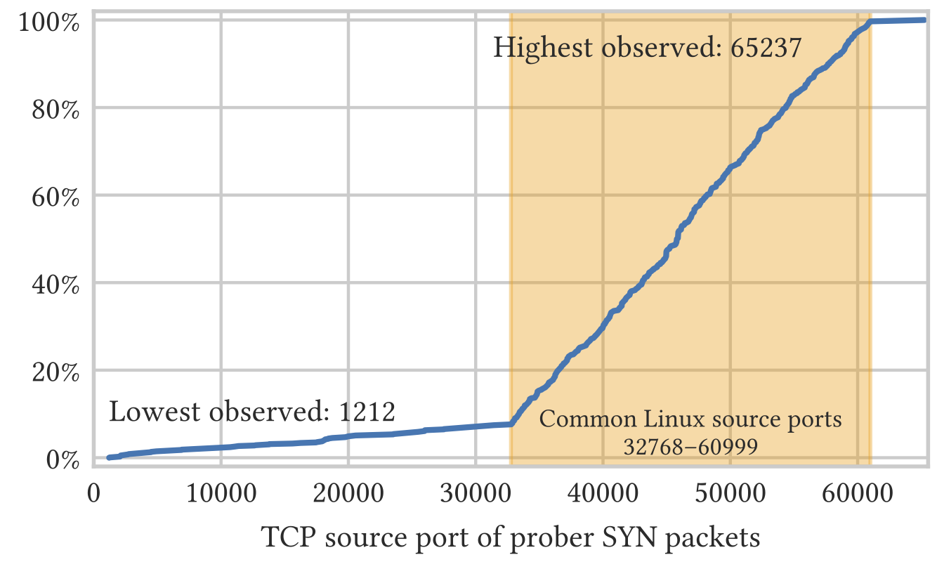 GWF不区分流量方向。我们在中国设置了一个Shadowsocks服务器,并从境外连接自动浏览Alexa排名前100万网站的子集,由此生成代理流量。服务器收到大量主动探测。这个结果表明,无论服务器是在中国境内还是境外,GFW都会对可疑服务器进行探测。这种双向触发探测的行为,与Winter和Lindskog的观察不同,他们在研究中发现外部到内部的Tor连接不会触发主动探测 [56, §4.4] 。另一方面,对于许多协议,GFW已知不作流量方向的区分,其中包括DNS [1, §2],HTTP [11, §3]和TLS [9, §3.1]。甚至已知,GFW对方向的敏感度会随着时间而变化,如TLS ESNI的封锁案例,其中有两周是双向然后变成单向 [6]。