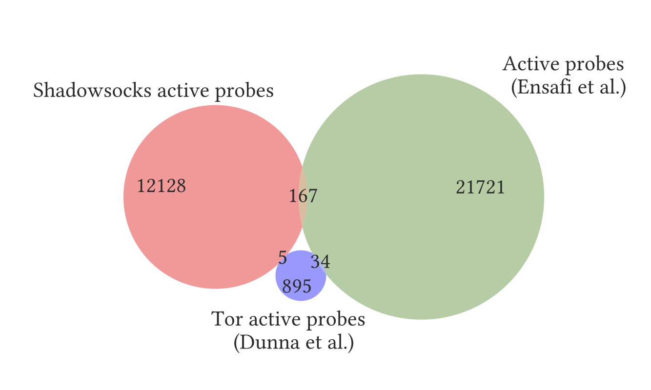 将我们的探测器IP地址列表,分别与下述地址进行了比较:Dunna等人在2018年观察到的向Tor服务器发送主动探测的934个地址 [13],以及Ensafi等人在2010年至2015年期间观察到的发送各种类型主动探测的22000个地址 [14]。图4表明,这三组地址仅略有重叠。我们注意到,在以前的实验中负责发送大量探测的IP地址202.108.181.70 [14, §5.3],并未出现在我们的观察数据中。鉴于以前的研究中观察到探测器IP地址周转率较高,这种仅有小部分重叠的结果实属意料之中。