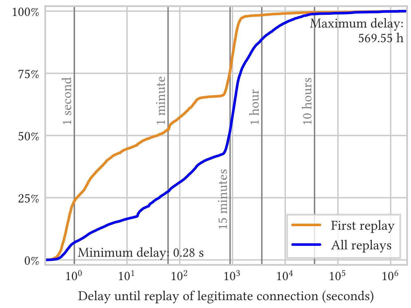 此外,使用流加密时,攻击者可以检测是否存在重放过滤器。例如,攻击者可以向服务器发送两次相同的随机探测。如果第一次探测碰巧导致传出连接至某个远程服务器,而第二次探测被重放过滤器拦截,那么通过这种响应时间的差异,攻击者可以判断是否部署了重放过滤器。虽然无法确认这就是GFW使用的确切逻辑,但我们确实观察到,大约10%的NR2型探测被多次发送到同一台服务器。