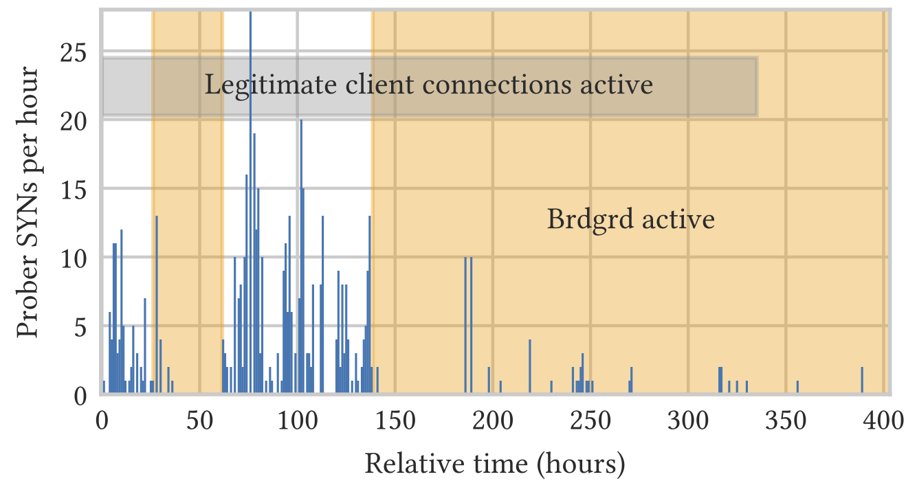 作为测试,我们搭建了Shadowsocks服务器,并设置客户端每5分钟进行16次服务器连接。随机启用和禁用brdgrd,并测量两种情况的主动探测比率。表1概述了实验的时间跨度。
