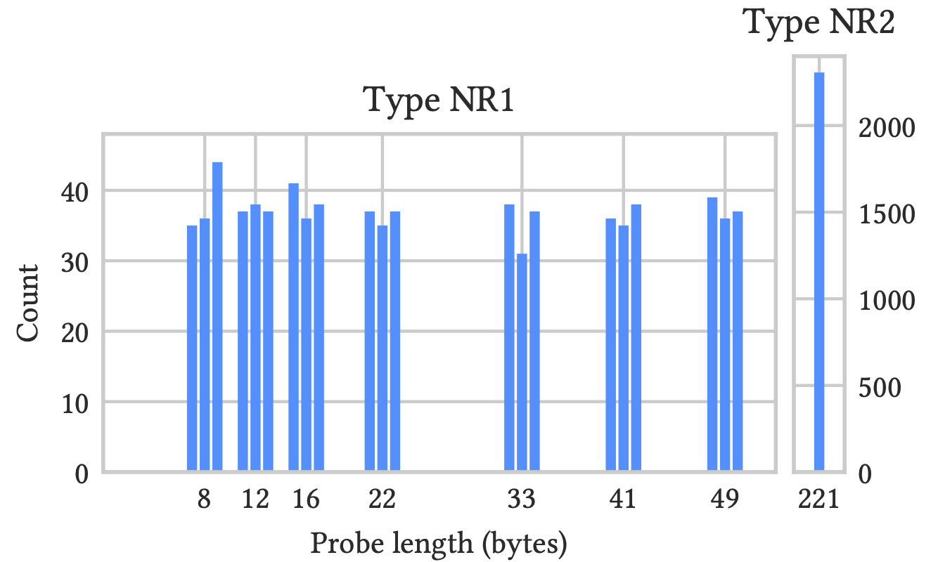 另一类貌似随机的探测,具备不同的长度。其内容在任何方面都不同于之前我们可识别的合法连接。我们将这一类探测的名称指定为以“NR”(表示“非重放”)开头:
