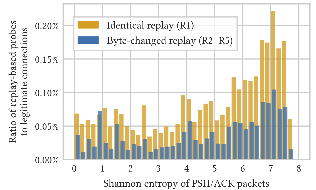 高熵的数据包更可能被重放。有两个证据支持这一结论。第一,图9显示,虽然各种熵的数据包都可能被重放,但是每字节高熵值为7.2的数据包被重放的可能性,几乎是低熵值为3.0的数据包的四倍。第二,实验1.a和实验2仅在数据包的熵上有所不同,在同一时间段内,实验1.a中服务器接收的探测显著多于实验2中服务器。