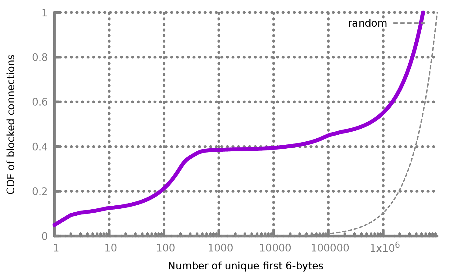 我们发现的0.6%的连接也有可能就是完全加密流量。为了研究这种可能性,我们对每个连接中看到的独特的6字节前缀的数量进行了统计,根据推断出的规则,这些前缀将被GFW阻止。如果这些连接都真的是完全加密的代理,那么我们与其会看到在可能的6字节值上有一个均匀的分布(256^6)。否则,如果有频繁出现的6字节值,那么这些前缀则有可能属于流行协议,这也就代表GFW的流量检测出现了误报。