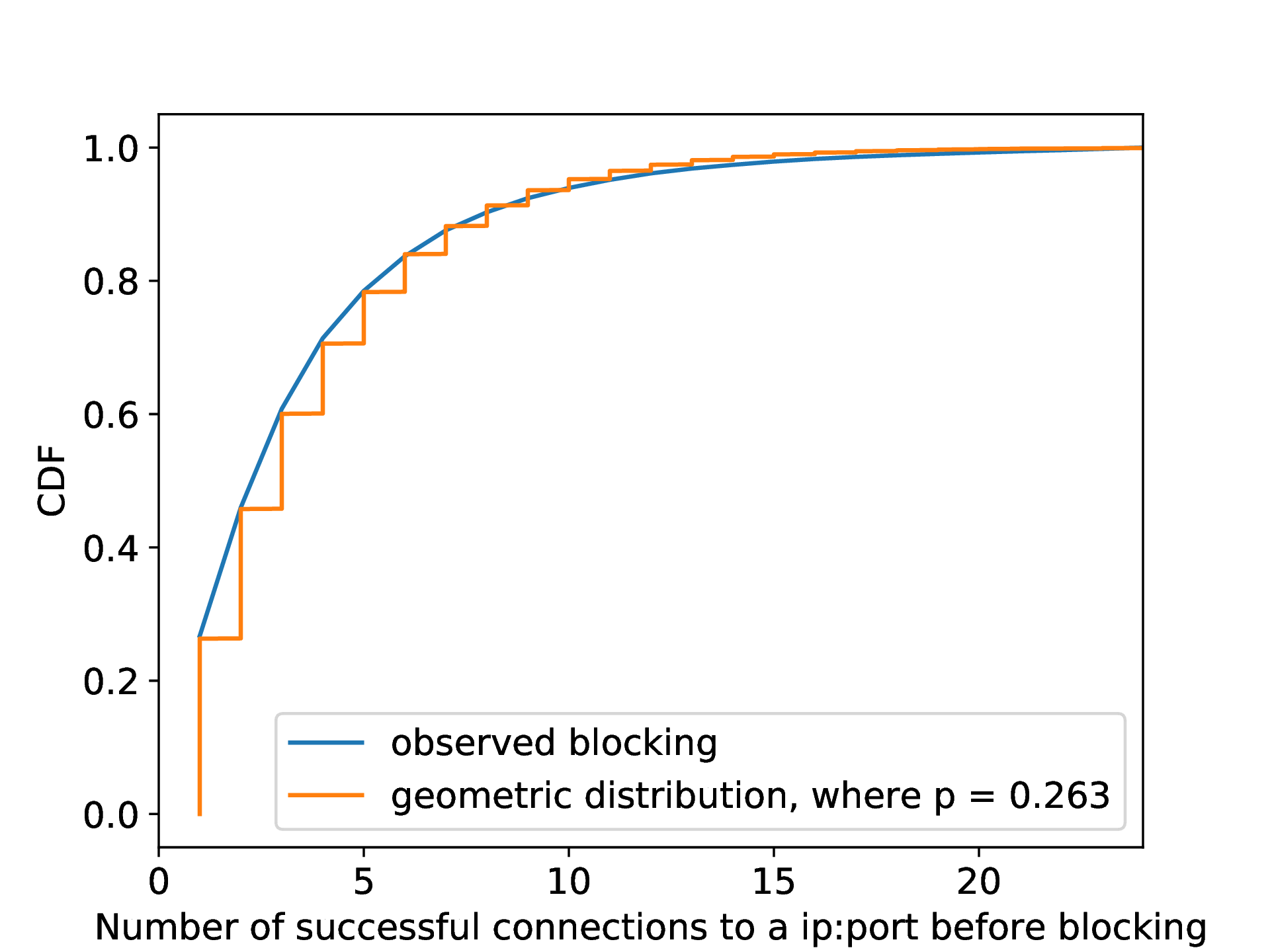 估计封锁概率。 在我们对10%的互联网的扫描中(第6.2节),有109,489个IP地址被我们标记为受到封锁影响。如第5节所示,在被封锁之前,我们可以与每个IP地址进行成功的随机数据连接的数量分布符合一个几何分布。这个结果表明,对每次连接的阻断是独立的,概率为\(26.3\%\)。