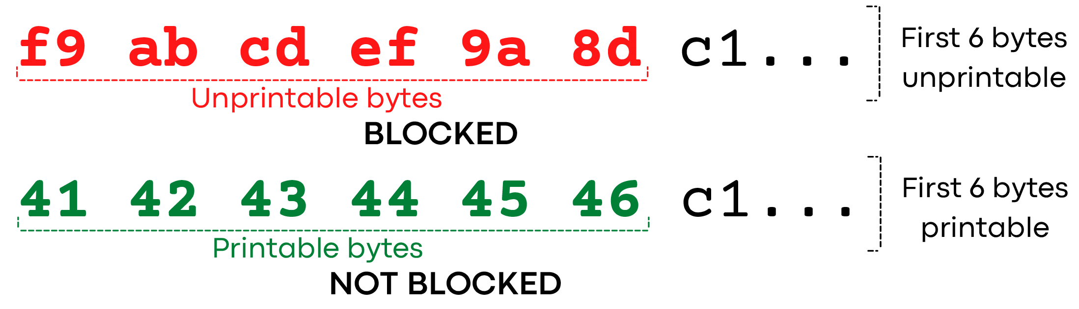 我们观察到,如果一个连接的前6个字节在可打印的字节范围0x20-0x7e内,那么GFW就会豁免该连接。如果前6个字节中有超出这个范围的字符,那么连接就可能会被阻止,前提是它没有符合其他豁免的规则(例如,每个字节集有少于3.4位的\(1\)比特)。