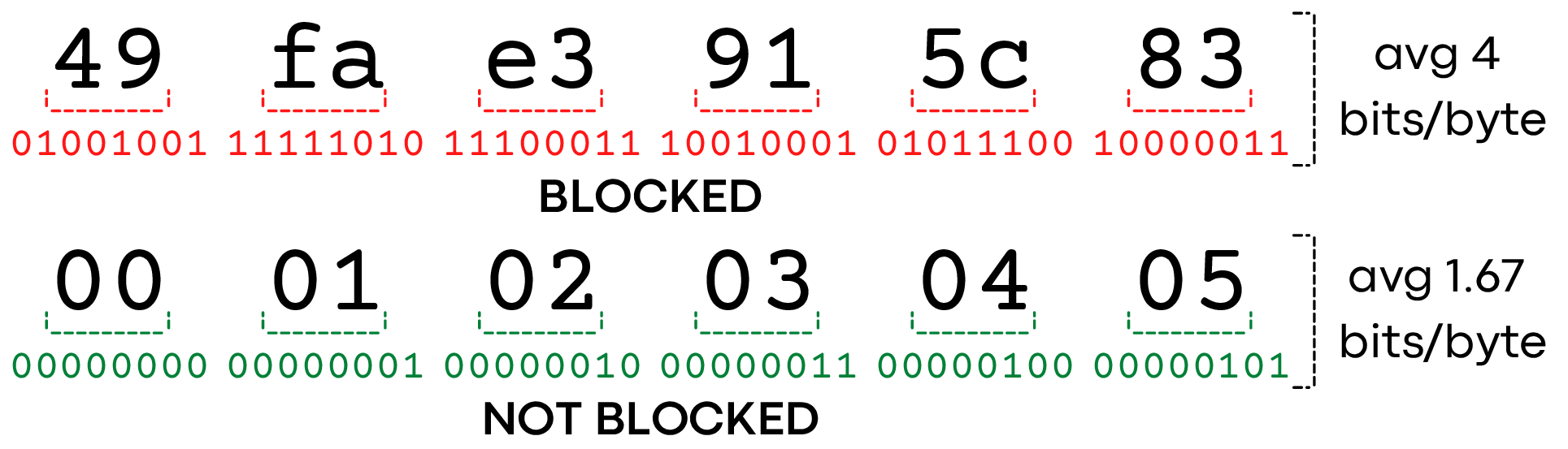 所有被阻断的模式的每个字节的八位比特中都恰好有4位是\(1\)比特(例如,二进制的\x1b是00011011)。 我们猜想每个字节的\(1\)比特的数量可能起作用,因为均匀的随机数据将有接近相同数量的二进制的\(1\)比特和\(0\)比特。实质上,这是在测量客户端数据包内的比特的熵。