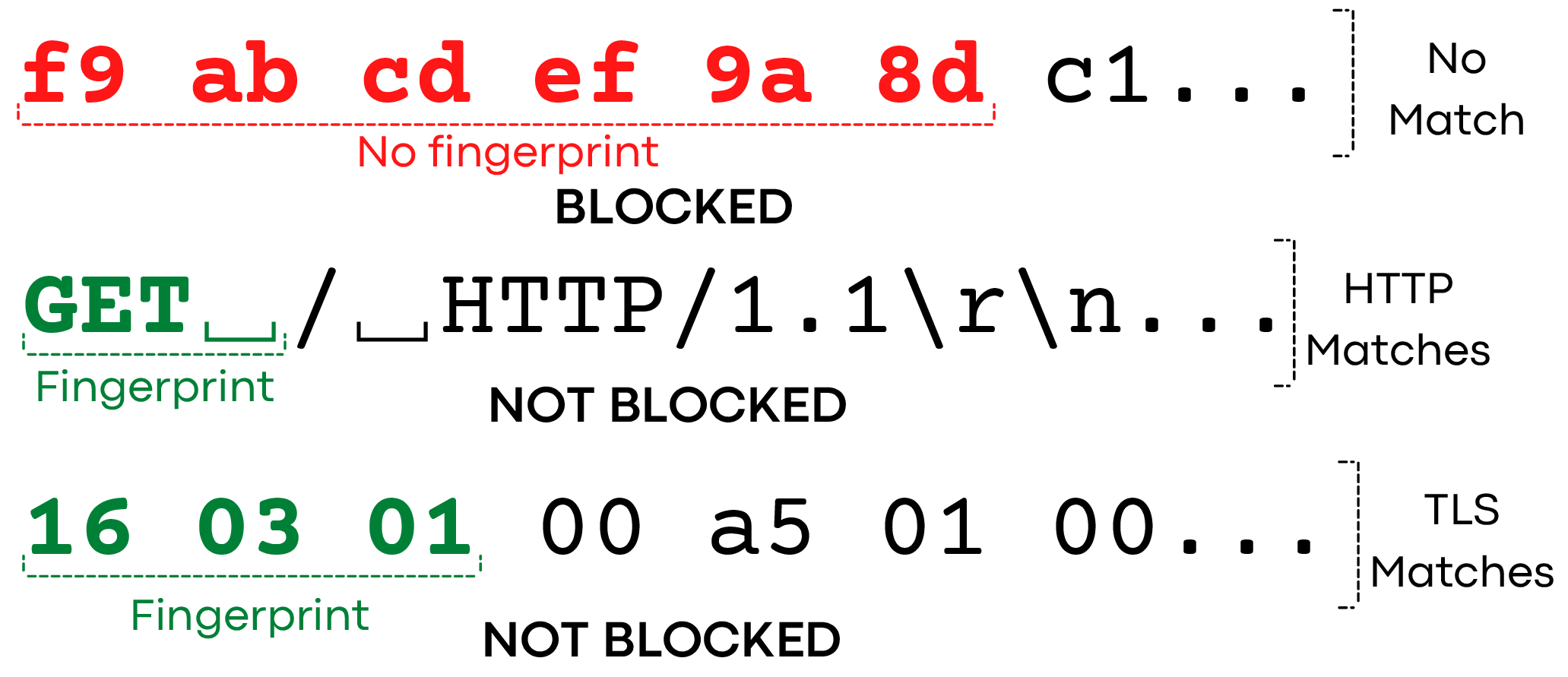 TLS。 TLS连接以TLS ClientHello消息开始,该消息的前三个字节会使GFW豁免连接。我们观察到,GFW豁免了任何前三个字节与以下正则表达式匹配的连接: