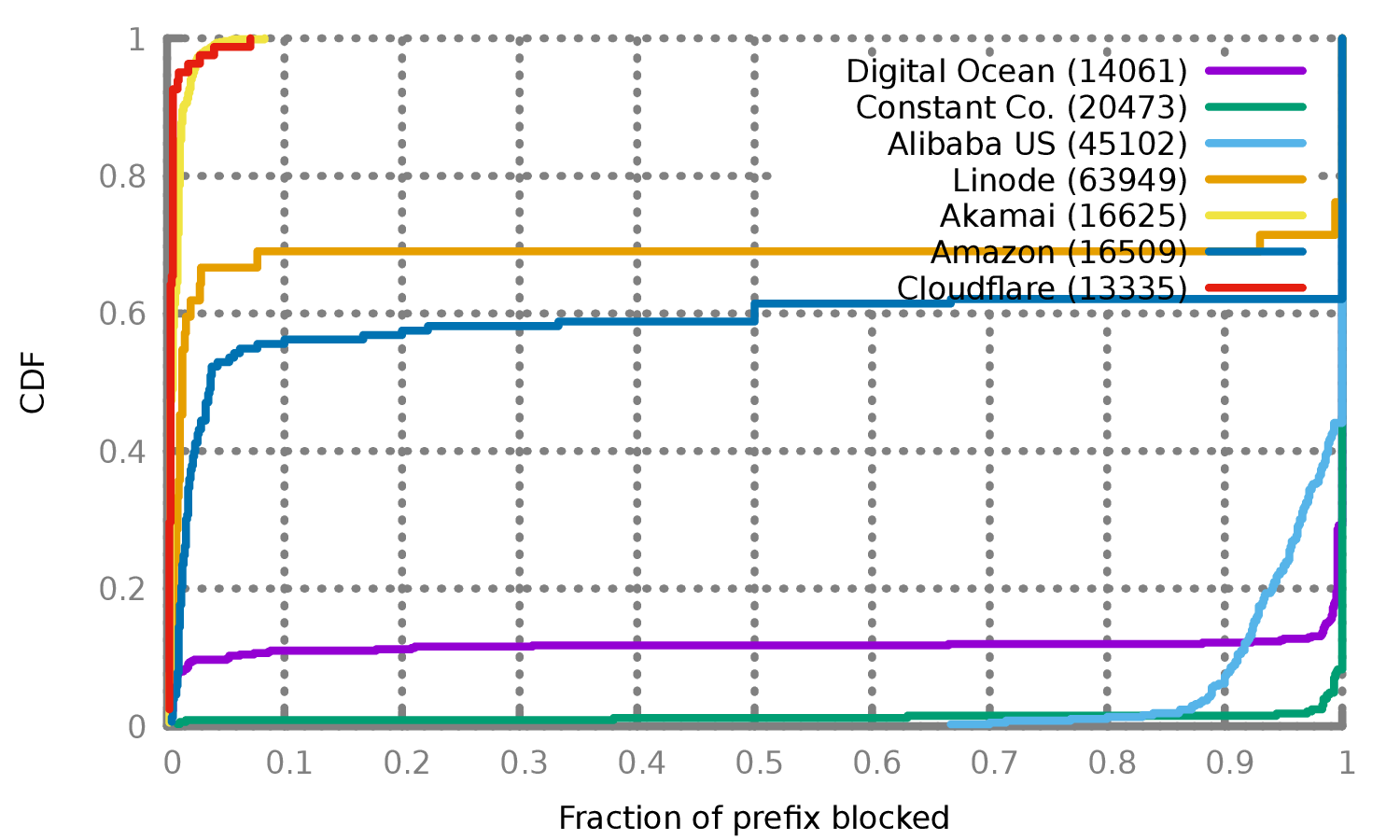 图4显示了受影响最大的AS。虽然测量结果偏向于显示较大规模的AS(因为在我们的扫描中占有更多的IP),但它显示了受到严重影响的AS(例如,阿里巴巴美国,Constant)和未受影响的AS(Akamai,Cloudflare)。此外,一些AS既有受影响的IP前缀,也有不受影响的IP前缀(亚马逊、Digital OCean、Linode)。我们看到的所有受影响或部分受影响的AS都是受欢迎的,可用于托管代理服务器的VPS供应商。而未受影响的大型AS通常不向个人客户出售VPS主机(如CDN)。